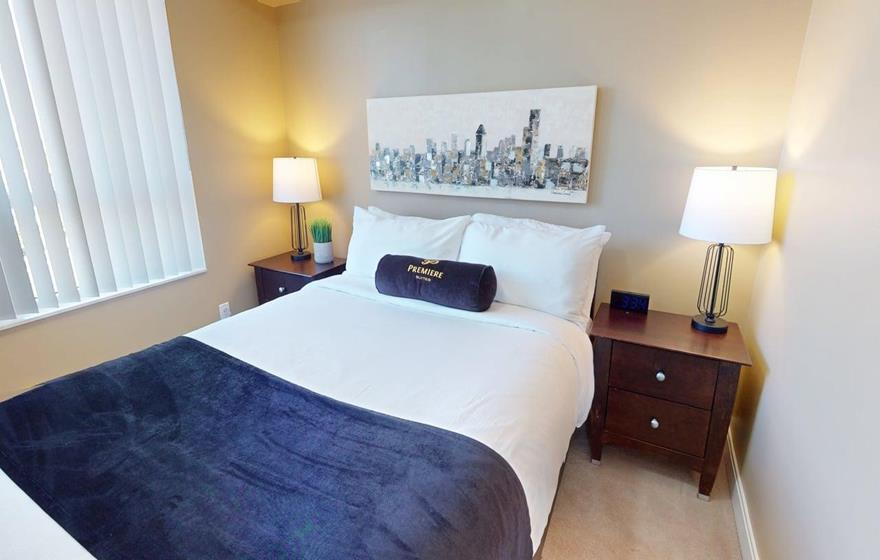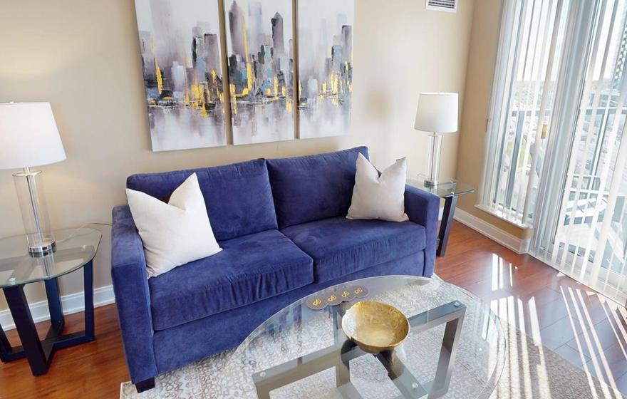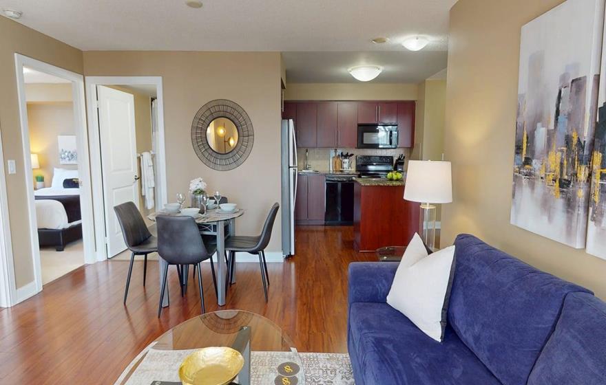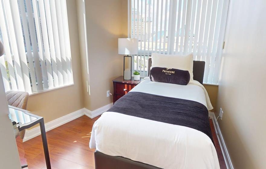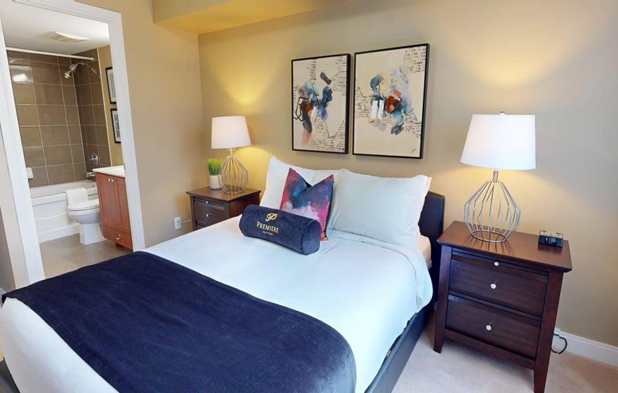 Ces appartements entièrement meublés présentent des aires ouvertes, des cuisines entièrement équipées avec comptoirs en granite et électroménagers pleine grandeur, des balcons privés et un espace de travail dédié.